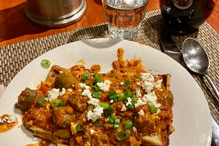 Shakshuka with Lamb Merguez Sausage on Savory Waffles