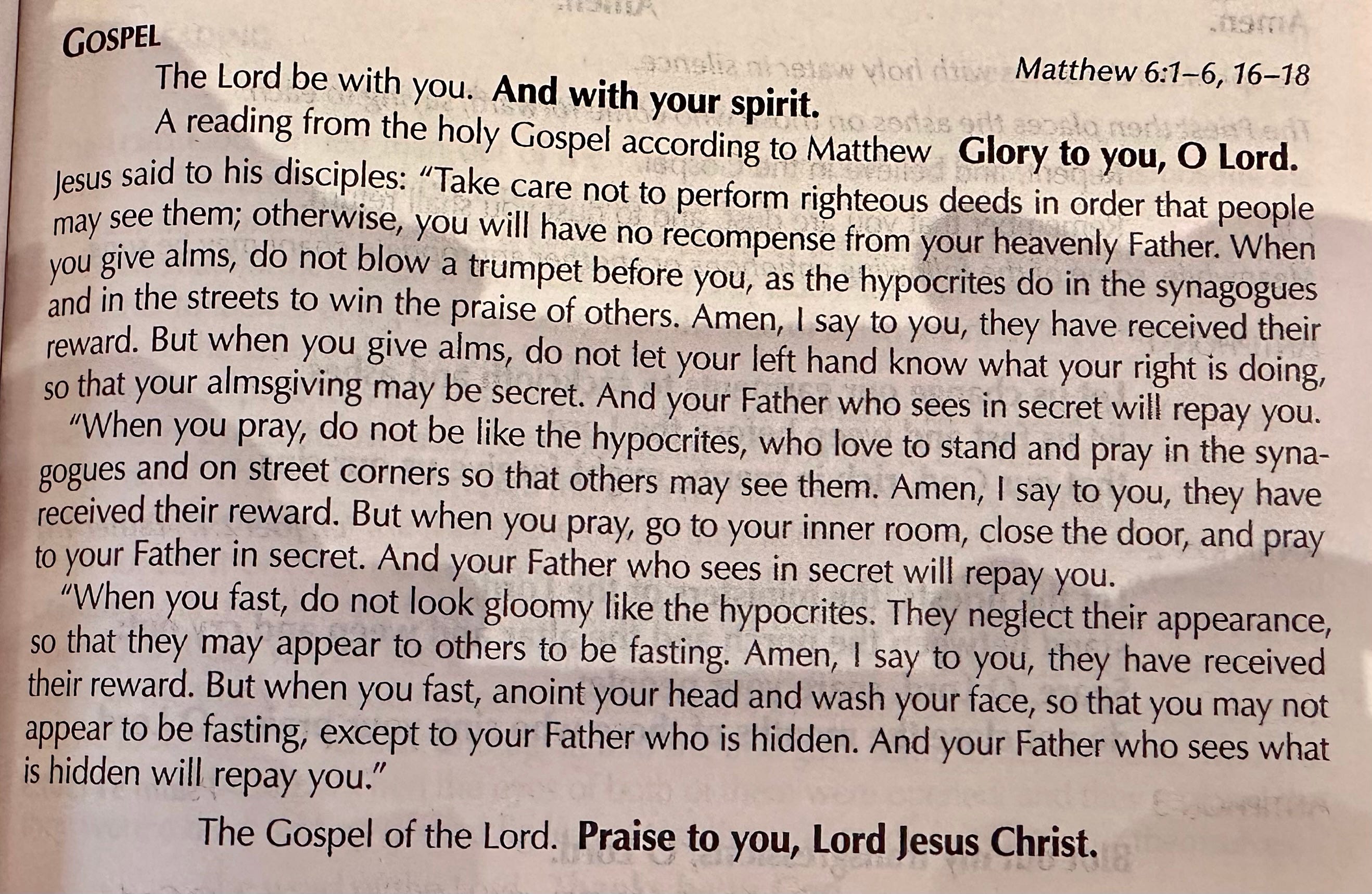 Today, for example, as I was sitting in noon Mass at my parish awaiting the imposition of ashes, I was struck by the day’s Gospel reading from Matthew Chapter 6.