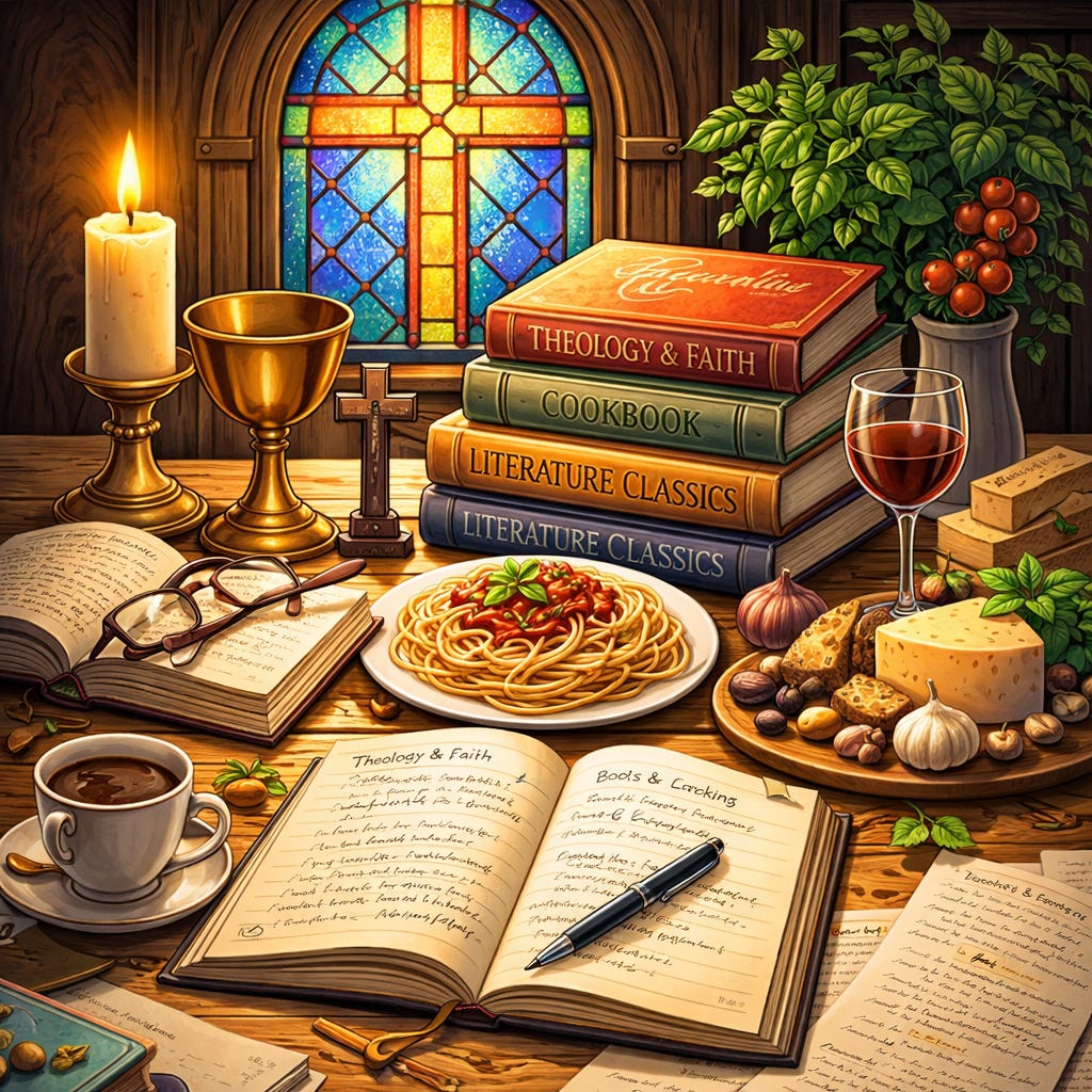 At the outset, I told you this was going to be an eclectic blog. The last three posts are about as eclectic as you can get: a science fiction recipe, a recipe for lasagna, and now some musings on Catholic theology. Welcome to my online world.